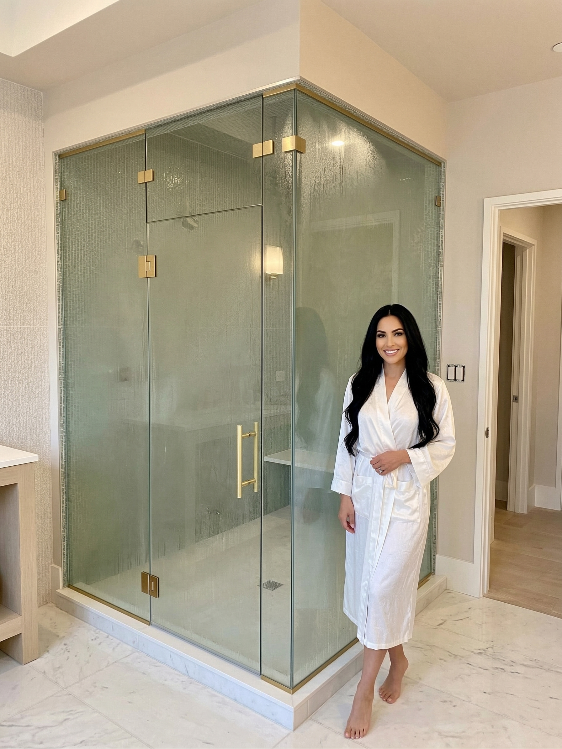 And right there in the center of it all is the shower — clean glass, smooth lines, and no bulky metal framing breaking up the view.