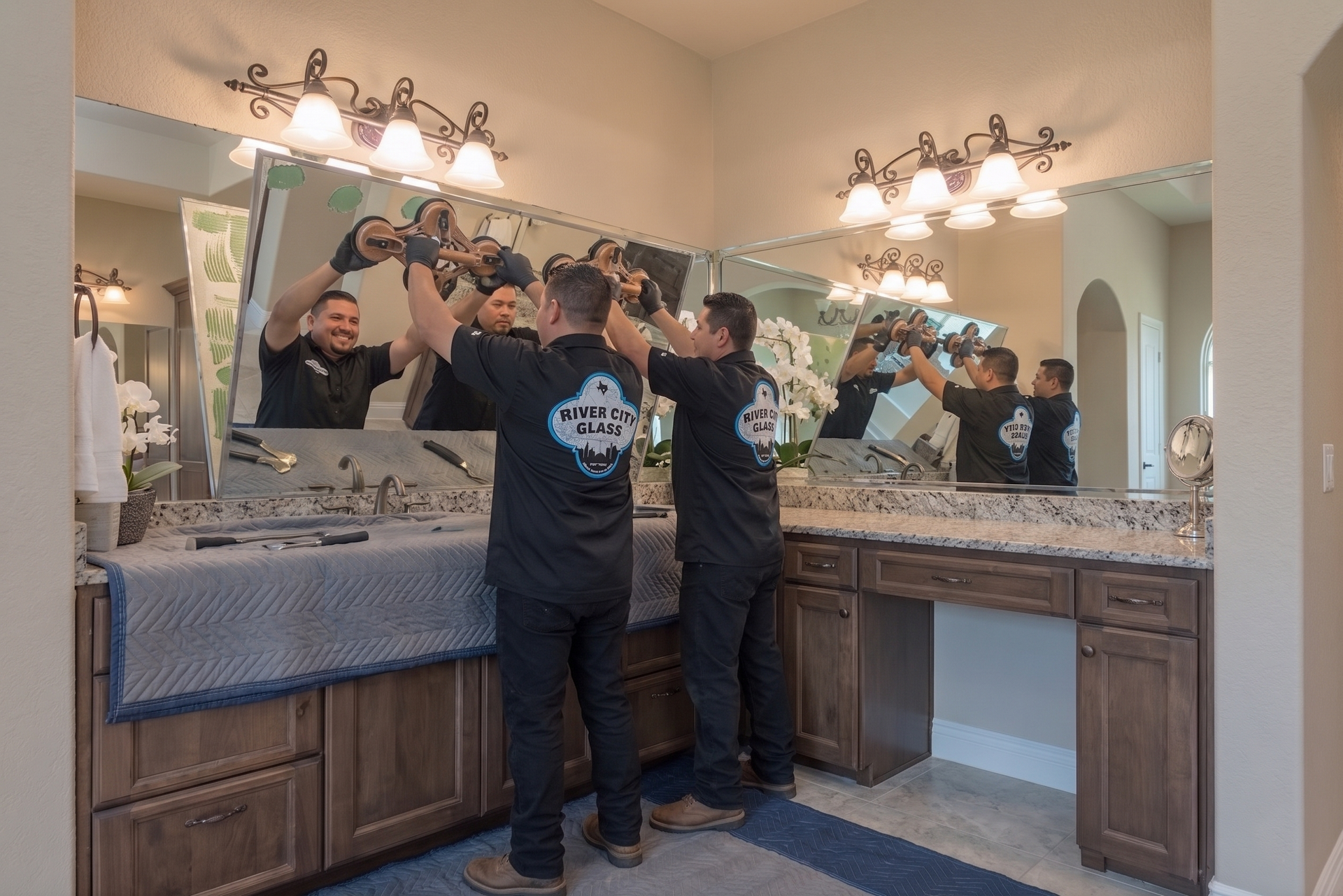 In neighborhoods throughout Dominion, Terrell Hills, Cordillera Ranch, and luxury remodel communities in New Braunfels, we are often called specifically because homeowners do not want to risk a shattered oversized mirror damaging a newly renovated bathroom area.